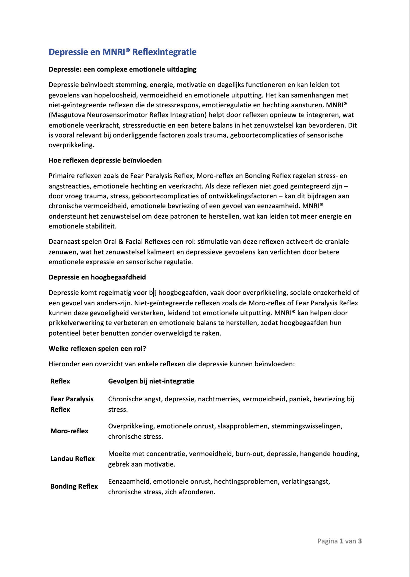 DownloadInformatiesheets Wat is Reflexintegratie Download de informatiesheet hier. Autisme en reflexintegratie Download de informatiesheet hier. Angst en reflexintegratie Download de informatiesheet hier. Wat is MNRI®? Download de informatiesheet hier. De wetenschap achter MNRI® Download de informatiesheet hier. MNRI® opleiding Download de informatiesheet hier. Leerproblemen en Reflexintegratie Download de informatiesheet hier. Reflexintegratie en NAH Download de informatiesheet hier. Depressie en MNRI Reflexintegratie Download de informatiesheet hier. MNRI info voor rij-instructeurs Download de informatiesheet hier. Klassieke wetenschappers Download de informatiesheet hier. Geboorte en MNRI reflexintegratie Download de informatiesheet hier.